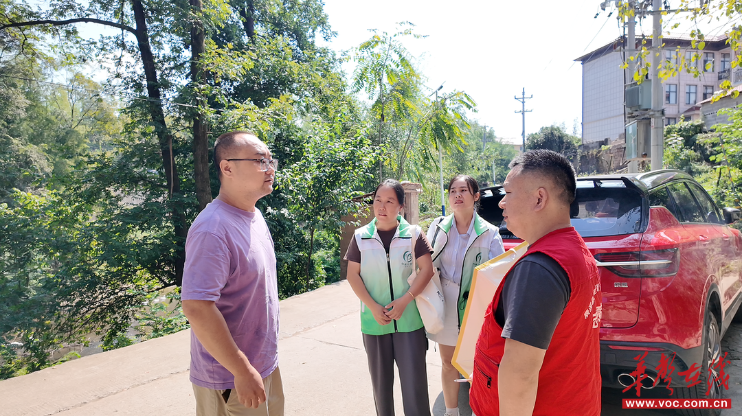 入户前锦滨镇民政办主任、社工与商会代表交流住户情况