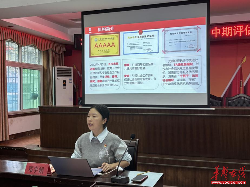 评估流程严谨有序、环环相扣,涵盖项目介绍、成果展示、资料审查、电话抽查、交流互动和评估反馈等多个环节。会议伊始,洪江市民政社工站项目主任借助PPT,对项目背景、服务开展情况、服务成果以及下一步工作计划进行了全面介绍,直观呈现项目实施以来的显著成效与社会影响。随后,评估组成员对项目相关文件、服务记录、财务报表等资料展开细致审查,确保项目严格遵循既定计划与规范推进。