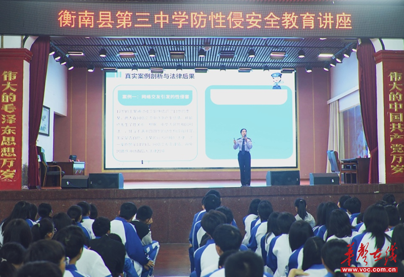 华声在线10月16日讯(通讯员 胡一飞 蒋媛竹)为强化学生法治观念,提升未成年人自我保护能力,近日,衡阳市衡南三中联合江口派出所及衡南县公安局团委,为高一全体学生举办了一场以“守护青春,远离侵害”为主题的法治安全教育专题讲座。本次活动邀请了江口派出所所长、该校法制副校长王聃,衡南县公安局团委书记邓姿姿以及民警李前锋担任主讲人。