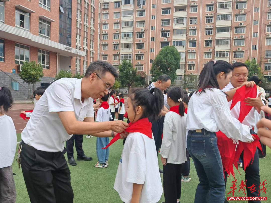 仪式上,大祥区华夏方圆学校相关负责人宣读了2025年“建队日”新队员入队决定。与会领导、嘉宾和老队员共同为新队员佩戴上鲜艳的红领巾。新队员在大队辅导员的带领下庄严宣誓,誓言铿锵,目光坚定。