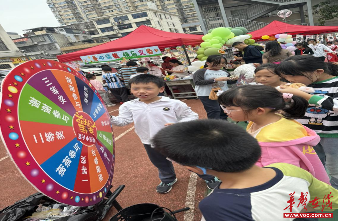 段书记和汪校长一起敲下开市锣,将全场气氛推向高潮,大操场化身为热闹而不失秩序的“爱心集市”。各中队在班主任与家长志愿者的协助下,精心布置铺面,设计宣传口号,推出特色商品。旧书籍、手工艺品、文创玩具、可口美食琳琅满目,每一个摊位都凝聚着学生们的创意与心血。五乙班王语宸家长给全校师生捐赠零食,获得了全场热烈欢呼。