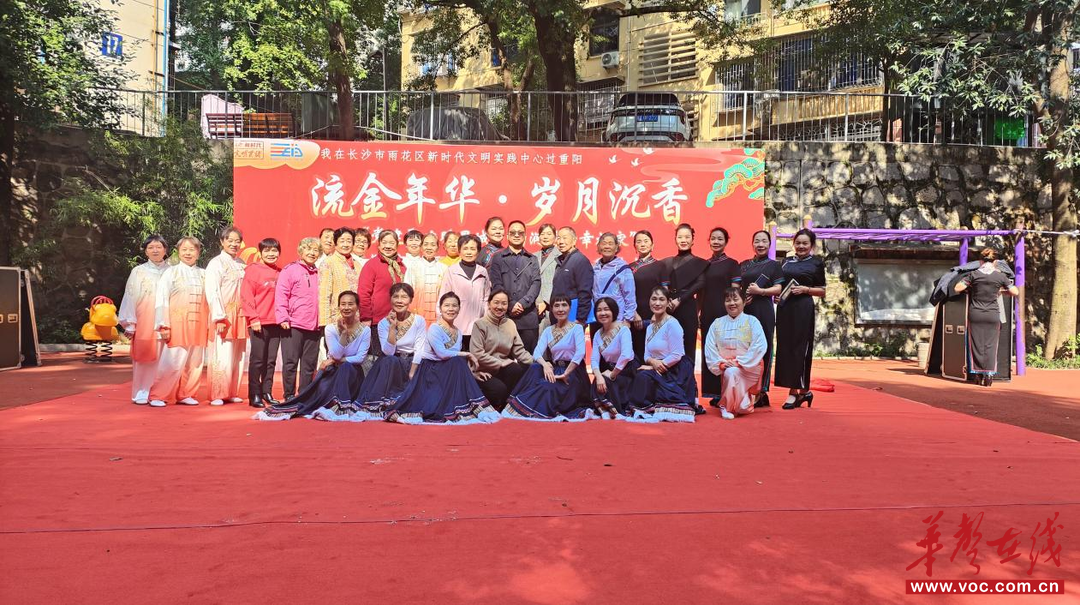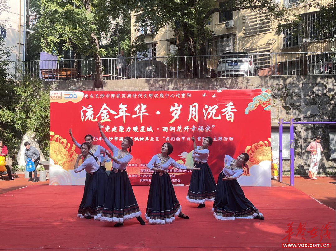 华声在线10月23日讯( 通讯员 舒璇 )近日,在长沙市雨花区委社会工作部统筹指导与社区惠民资金支持下,枫树岸社区新时代文明实践站联合长沙市社区文化建设促进会、枫树岸社区君泓居家养老服务站在金福苑小区健身广场举办了“流金年华·岁月沉香”重阳活动。活动集文艺汇演、趣味互动、便民服务与安全宣传于一体,为社区居民带来了一场精彩纷呈的节日盛宴。