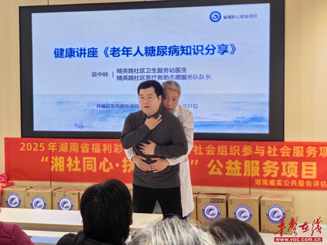 华声在线11月21日讯( 通讯员 吴青云 )11月21日,“湘社同心·扶老育幼”公益服务项目在长沙市开福区东风路街道精英路社区党群服务中心一楼会议室举办。本次活动聚焦老年人健康关爱,由开福区东风路街道精英路社区与湖南唯实公共服务评估中心联合主办,并得到了农工党长沙市开福区药业支部、开福区东风路街道社工站、精英路社区卫生服务站的支持。