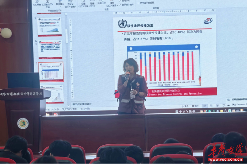 华声在线9月30日讯(通讯员 罗冠军 王恒)“艾滋病病毒不会通过共餐、拥抱传播,但共用剃须刀可能暗藏风险……”9月25日衡南县耀湘职业中等专业学校学术报告厅内座无虚席,新生健康教育第一课堂以“青春无‘艾’,健康同行”为主题的艾滋病防控专题宣教活动正在进行,为帮助刚踏入校园的职专新生树立科学防艾意识。衡南县疾病预防控制中心健康科普官们根据青少年群体特点,通过多元形式开展艾滋病防控宣传,为新生健康成长筑牢第一道防线。