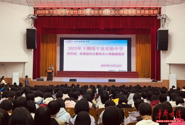华声在线10月23日讯( 通讯员 龙海华 蒙晓群 )近日,邵阳市绥宁县实验中学聚焦青少年安全防护与心理健康成长核心议题,以“利剑护蕾,心向暖阳”为主题,分批次开展讲座。讲座围绕防性侵、防欺凌、心理健康教育三大关键领域,为全校学生量身定制兼具指导性与实用性的“成长必修课”,切实筑牢校园安全防护屏障。