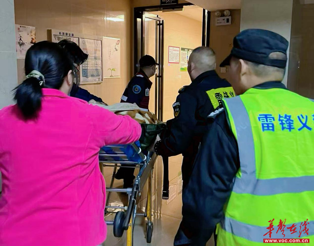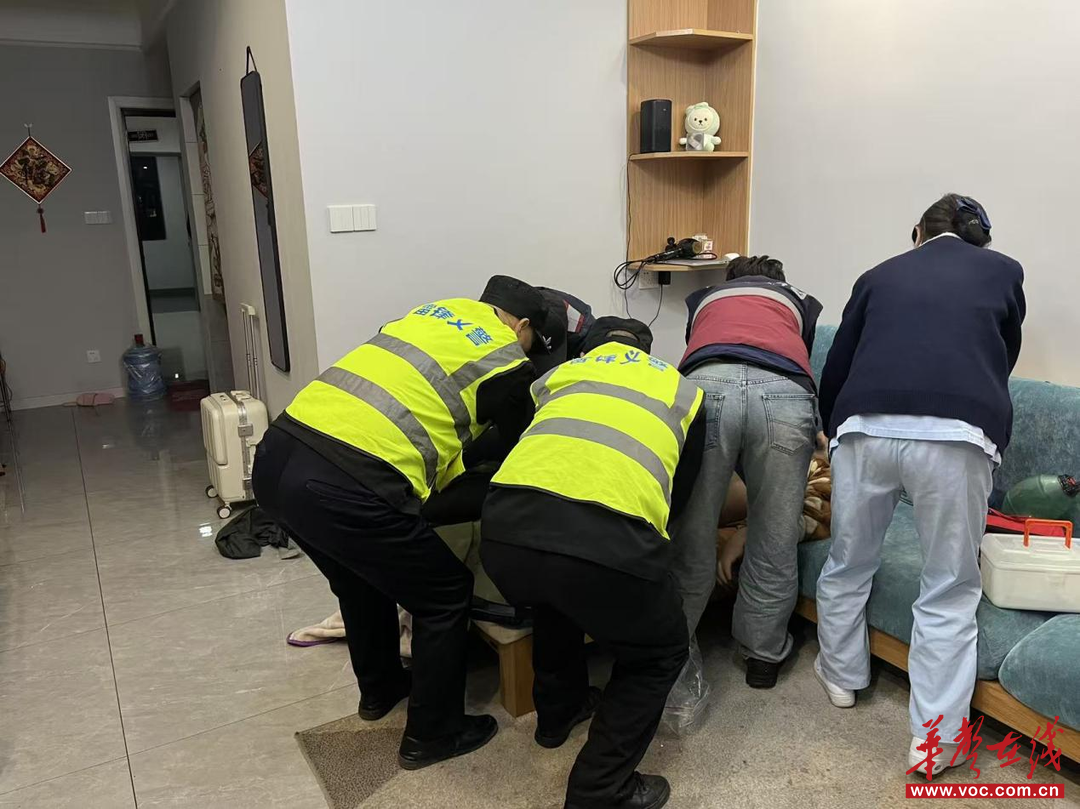 此时,天鹅塘社区“雷锋义警”正坚守在夜间巡逻岗位。看到120救护车驶入小区,队员戴玉奇意识到有居民需要紧急救助,他迅速通过对讲机向班长陈程汇报。陈程当机立断,即刻召集队员林建清、刘信秋和刘登洪,仅用3分钟便火速赶到业主家中。