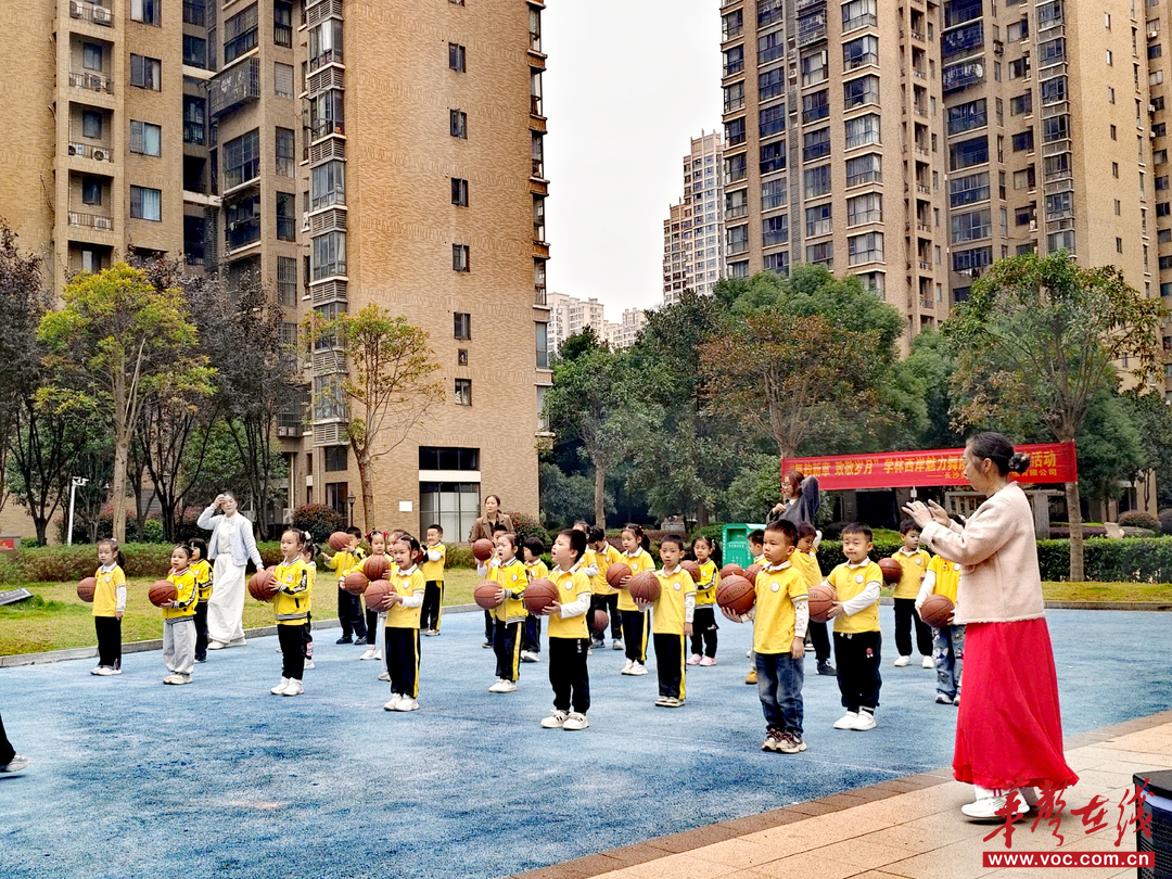 接下来,小区幼儿园的小朋友们身着统一的黄色运动服,手抱小篮球,迈着整齐的步伐走上场地。“一二一,拍起来!”随着老师的口令,小朋友们认真地做起了篮球表演。虽然动作带着孩童的稚嫩,却格外专注投入,篮球在小手中弹跳的节奏,配上孩子们清脆的笑声,瞬间让现场氛围变得更加活泼温馨。