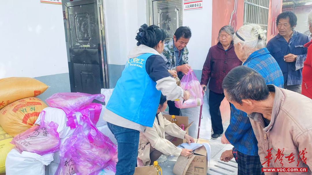 活动现场,民政社工与村干部们早早地将准备好的慰问物资摆放整齐。这些物资经过精心挑选,贴合老人们的日常生活需求,包括优质的食用油、本地特色的米粉以及象征健康长寿的“长寿面”。