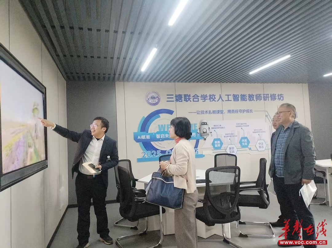 全体参会人员参观了三塘联合学校人工智能教师研修坊,实地感受联合学校在硬件设施与专业服务上的投入。工作坊自主研发的智慧劳动基地交互式VR系统直观演示AI技术在融合教育中的前沿探索。