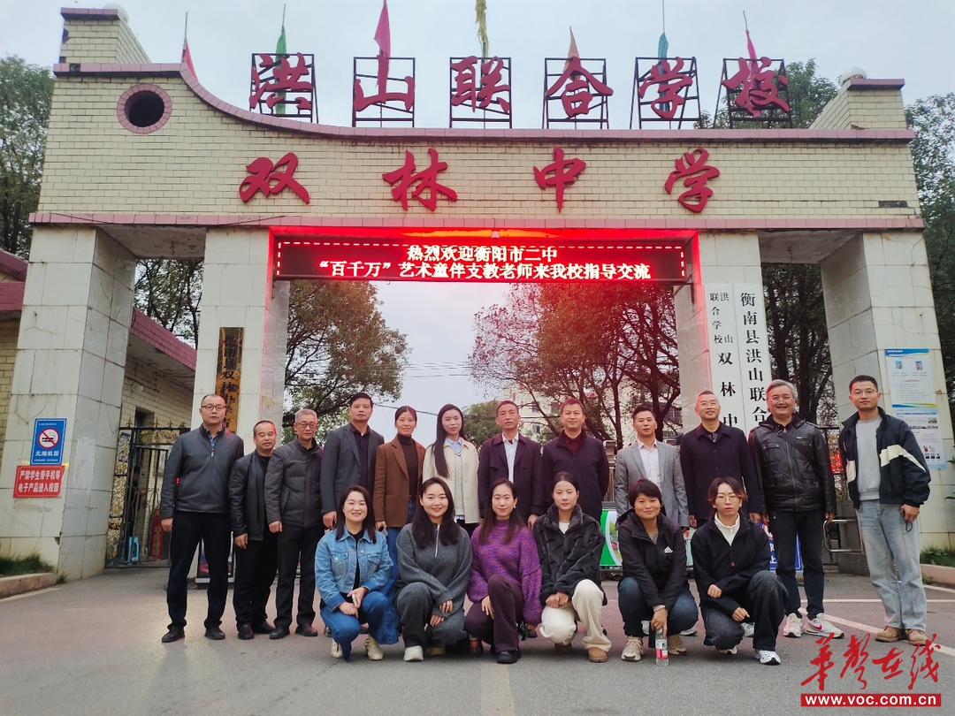 华声在线11月14日讯( 通讯员 曹姣姣 )为丰富乡村学生体育、艺术文化生活,搭建校际交流桥梁,11月13日下午,衡阳市第二中学赴双林中学开展“艺术童伴”支教活动。此次活动由衡阳市二中党委委员彭剑锋带队,创新教育中心主任邹谦、教研室主任肖明智、党政办主任曹姣姣、音乐教研组长邹进军、声乐老师何庆圆、舞蹈老师林湘、体育教师陈青、美术老师彭兆熊和刘志文一同参加。