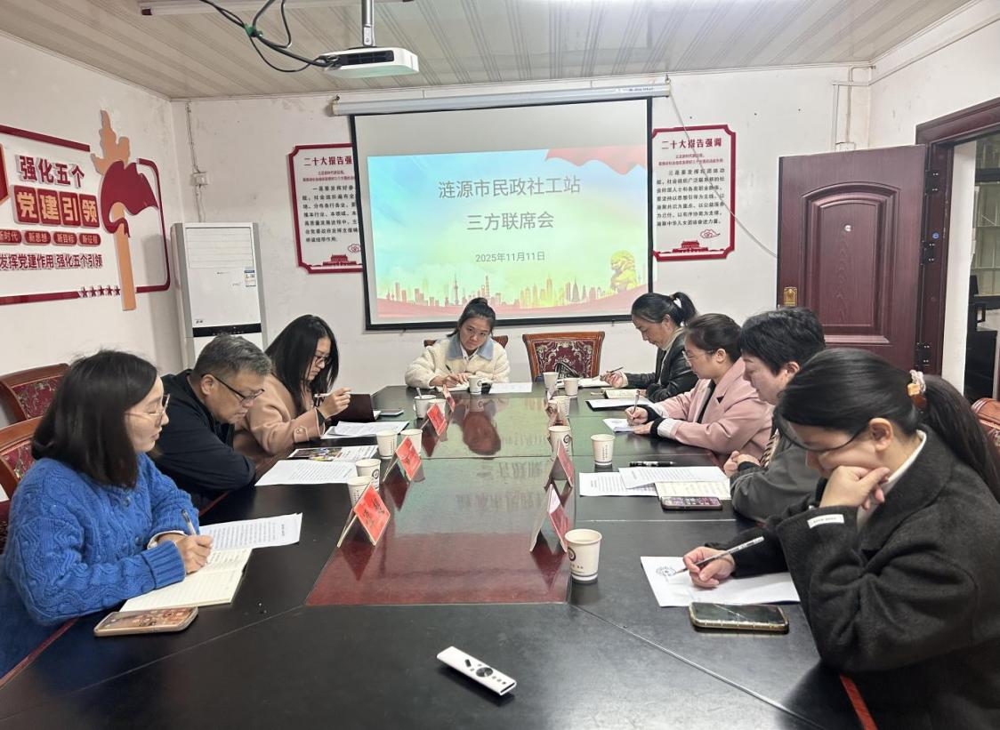华声在线11月14日讯( 通讯员 颜乔荔 )11月11日,在涟源市民政局的指导支持下,涟源市民政社工站三方联席会议在乐德社会工作发展中心二楼会议室顺利召开。涟源市民政局四级调研员黄飞、市民政局慈善股股长谭超、长沙仁与公益组织发展与研究中心和乐德社会工作发展中心相关负责人及市民政社工总站社工10人参加会议,会议分上、下午时段持续推进,在系统总结过往项目成果的基础上,围绕品牌化建设、人才培养、服务精准化三大核心,进一步探讨了下阶段涟源市民政社工站服务高质量发展的思路与方向。