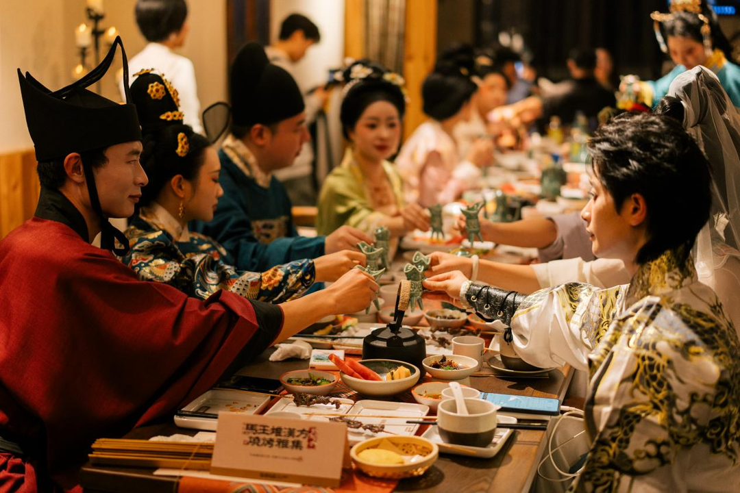 活动现场,同袍们各展风华,或参与投壶博弈,或巧手制作香囊,或品鉴特色马王堆汉方烧烤,在丰富多彩的互动中沉浸式体验传统文化魅力。这场别开生面的雅集,不仅是一场文化盛宴,更是一次穿越千年的美食欢聚。