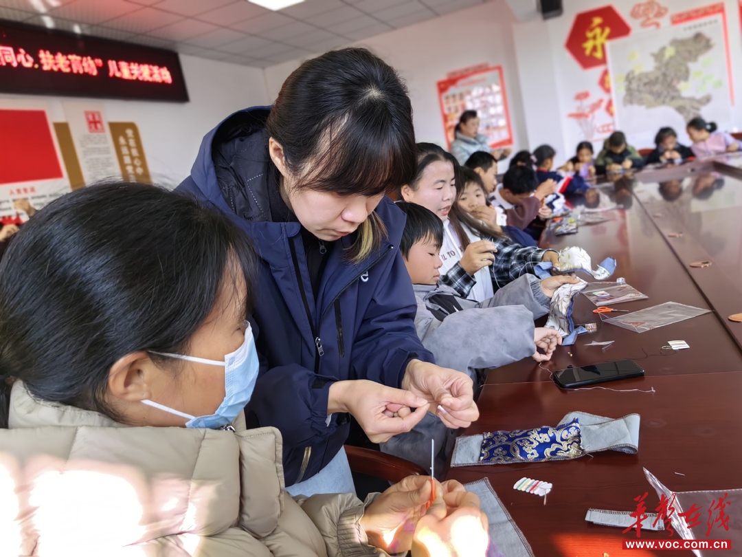 与此同时,胜和村二楼会议室里充满了孩子们的欢声笑语。这里专为困境、留守儿童打造了“非遗手工课堂”,志愿者通过趣味讲解与手把手教学,引导孩子们体验非遗魅力,在动手实践中培养创造力与专注力。活动尾声,工作人员为孩子们送上书包、文具等学习物资,鼓励他们好好学习、快乐成长,孩子们拿着崭新的学习用品,眼中闪烁着喜悦的光芒。