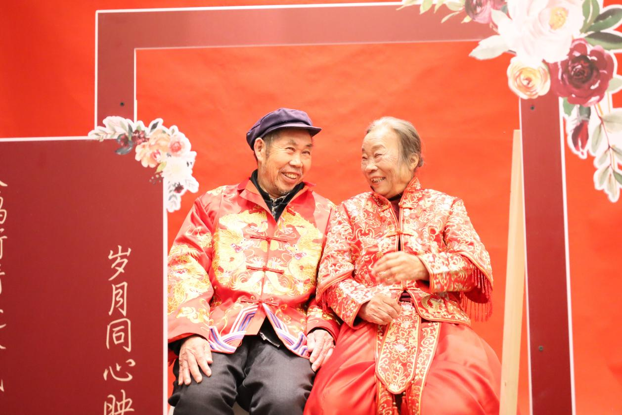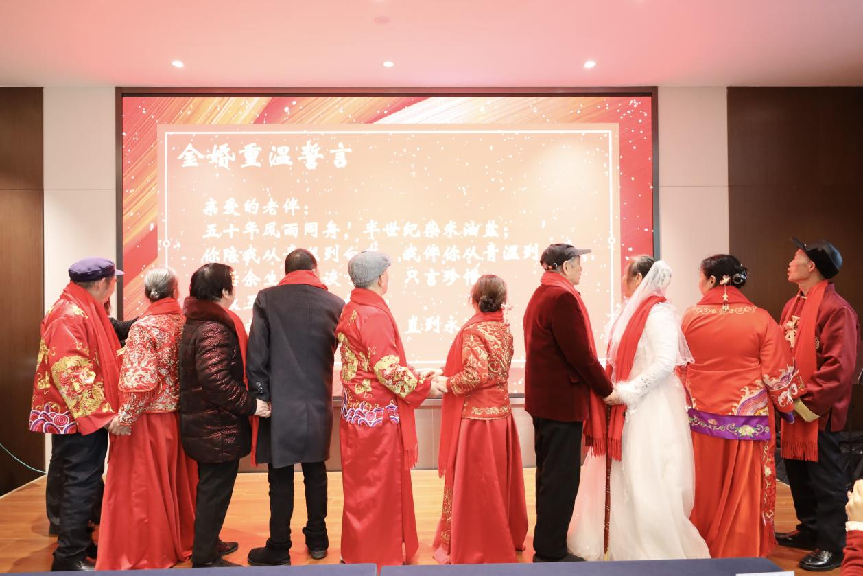 伴随着悠扬舒缓的《婚礼进行曲》,活动进入了最动人心弦的环节。志愿者们悉心搀扶着金婚夫妇们缓缓登上舞台。在全场嘉宾的见证下,他们面对面许下金婚誓言,简单质朴的话语承载着五十年的相知相守、不离不弃,深深打动了现场每一位观众,掌声与感动交织在整个会场。随后,现场还为每对金婚夫妇颁发了象征爱与坚守的“金婚证书”,将这份历经岁月沉淀的荣耀永久定格。