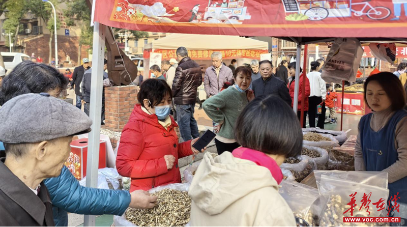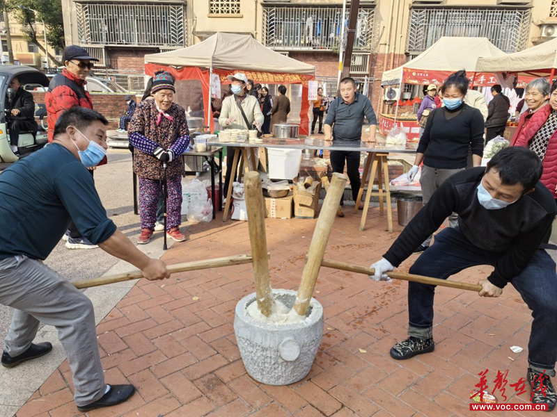 广场中央,打糍粑的石臼旁“砰砰”声不断,党员志愿者与居民轮番抡槌,蒸熟的糯米在木槌起落间渐渐成团,热气裹挟着香甜漫溢开来。“这打糍粑,捶的是团结劲儿,揉的是邻里情,聚的是治理力!”社区党员雷大姐擦着汗的话语,道出了基层治理的朴素真谛。旁侧霉豆腐的醇厚、腊肉的油香、炒板栗的焦甜交织成“乡土风味交响曲”,居民们试吃选购、笑语盈盈,“乡下直供的好东西,实惠又新鲜!”刚拎走两斤腊肉的陈师傅笑得眉眼弯弯。