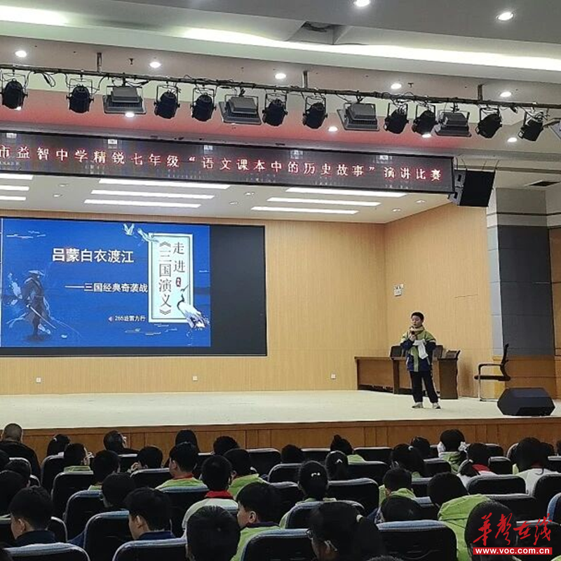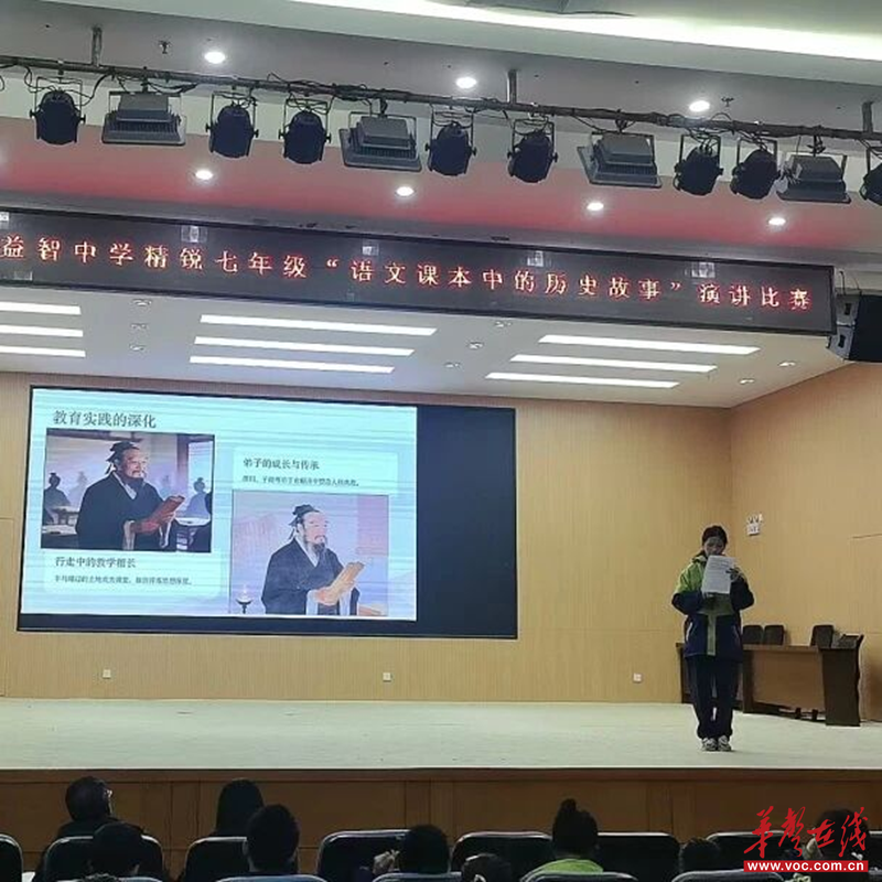 华声在线12月16日讯(通讯员 刘语嫣)近日,湘潭市益智中学七年级“初中语文课本里的历史故事”演讲比赛在学校报告厅圆满落下帷幕。14名学子以青春之声为媒,串联起课本中的历史记忆,让跨越千年的人物风骨与文化智慧在舞台上鲜活绽放。
