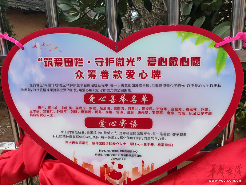 华声在线1月7日讯(通讯员 周小庆 帅利民)1月5日上午,株洲市荷塘区“向阳计划”社区精神康复项目主办的“筑爱围栏·守护微光”公益行动圆满举行结项仪式。荷塘区委社会工作部主任彭亚、金山街道主任薛颖玉、综合治理主任左丽及新市村书记袁立波等与二十多位爱心人士齐聚一堂,共同见证"爱心围栏"项目落成,以实际行动诠释"微光汇聚,守护希望"的公益理念。