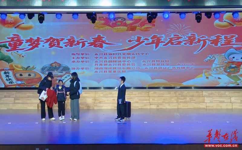 华声在线2月9日讯(通讯员 唐红)“爱从来不会缺席,只是有时候会晚到。”1月8日,2026年永兴县少儿春节联欢晚会现场,小品《让爱回家》以真挚动人的团圆场景引发全场共鸣,台下不少观众悄悄抹起了眼泪。随着背景音乐《假如爱有天意》响起,那一刻,思念与团圆的滋味,真实得让人心头一颤。这出打动人心的小品,正是湘阴渡街道民政社工站“福泽潇湘·银都护苗”项目的暖心成果。