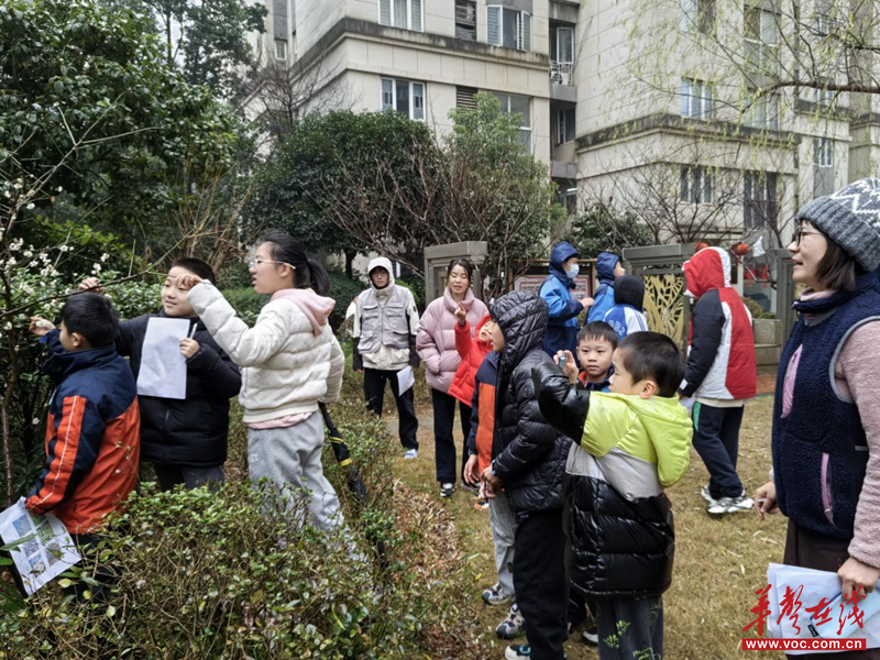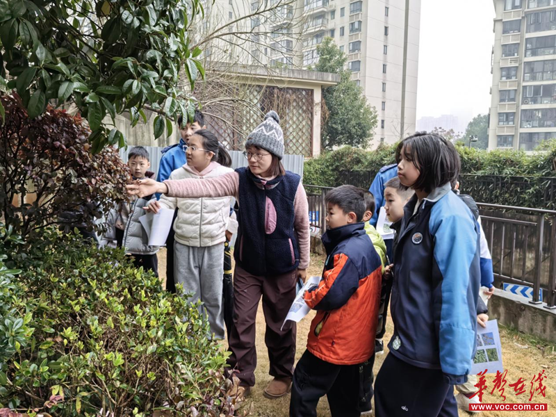 随后,小朋友们怀揣纸笔与植物图片,在老师和志愿者带领下走进小区绿化带,一场热闹的“植物寻宝”正式开启。“对照图片找一找梅花在哪?”老师话音刚落,孩子们便四散开来,比对叶片、提笔记录,不时呼喊:“老师,我找到梅花啦!”“这是红花檵木吧?和图片一样!”在老师指引下,孩子们依次认识了梅花、黄天竹、广玉兰、红花檵木、铁树、海桐等植物,活动中,老师逐一解答孩子们的疑问,对小区内常见的植物进行讲解,让自然知识在实地观察中落地。
