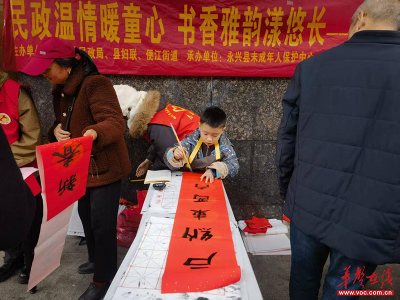 结营日的重头戏是春联赠送活动。上午,孩子们铺纸、蘸墨、挥毫,虽然笔画稚嫩,但“福”“春”“安”等字写得格外认真。随后,他们走上街头,将亲手书写的春联送给社区居民,以笔墨传温情、以书香送祝福。“奶奶,祝您新年快乐!”一句脆生生的祝福,让接过春联的老人笑得眼角泛起皱纹。随后,下午的结营仪式上,永兴县民政局儿童福利股刘晴薇女士与郴州市启辰恒福社会工作服务中心理事长唐红女士为优秀学员颁发荣誉证书,小小的证书承载着肯定与鼓励,也点燃了孩子们前行的动力。工作人员为二十余名孩子送上慰问物资,把党和政府的关怀、社会各界的温暖,实实在在送到孩子们手中。