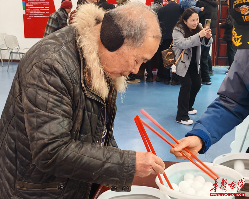 游园活动设置猜灯谜、夹元宵、趣味竞技等多项互动体验项目,兼具传统民俗特色与趣味性。“趣味猜灯谜”区域,一条条灯谜悬挂成排,老干部们或凝神思考,或会心一笑,猜中谜底后欢呼着领取“金币”奖励;“元宵夹夹乐”里,老干部们手持筷子,稳准狠地夹起乒乓球,引得围观者连连喝彩。大家通过参与活动集齐奖券,兑换榨汁机、生活用品等实用礼品,收获满满、笑意盈盈。