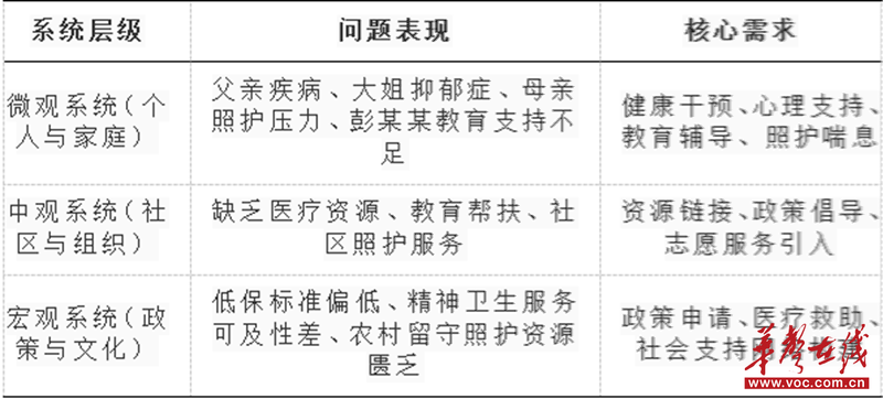 运用生态系统理论分析,彭某某家庭的问题并非单一因素造成,而是微观、中观、宏观系统交互作用的结果: