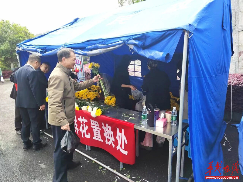 陵园以绿色低碳、文明安全为核心,积极推广文明祭扫新理念,大力推行以鲜花替代传统祭品的祭扫方式。园区专门设置鲜花置换点位,深入开展“鲜花换塑料花、香蜡”活动,累计为群众免费提供菊花一万余枝,积极引导群众摒弃焚烧香蜡纸钱、摆放塑料花等陈规陋习,倡导以敬献鲜花、擦拭墓碑、轻声追思等文明方式缅怀逝者,让清明祭扫更显温情、更具环保底色。